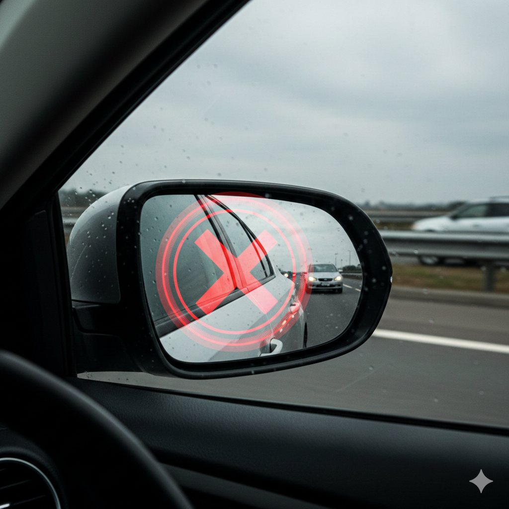 A small car or “Okada” can be right beside you—completely invisible—and your standard mirror will not show it.